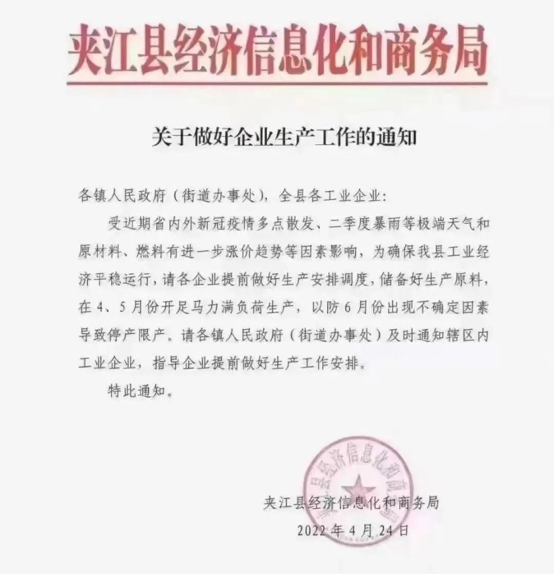 2022年4月24日,夾江縣經(jīng)濟信息化和商務(wù)局發(fā)布《關(guān)于做好企業(yè)生產(chǎn)工作的通知》,在通知中,明確要求各企業(yè)提前做好生產(chǎn)安排調(diào)度,儲備好生...